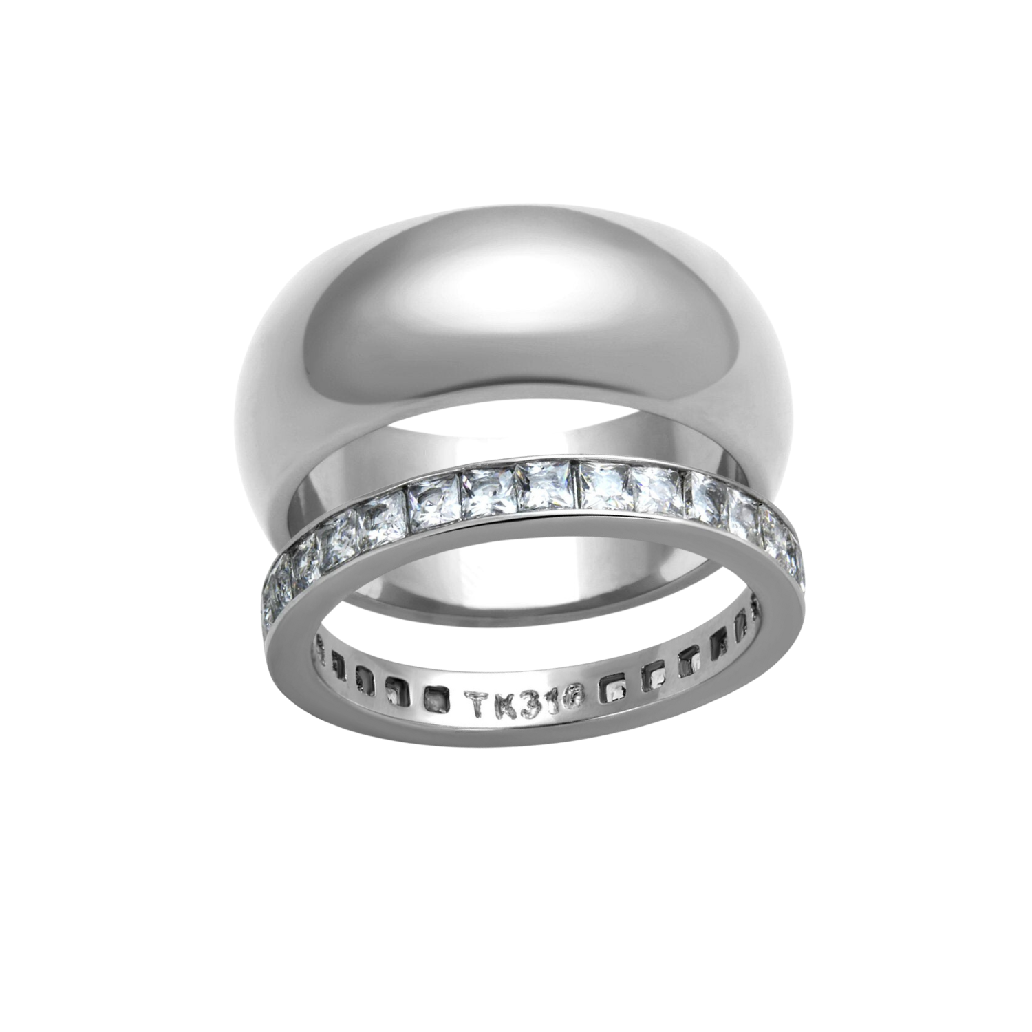 This 2-piece set includes 1 classic band and 1 eternity style band with square cut AAA-grade CZ stones.